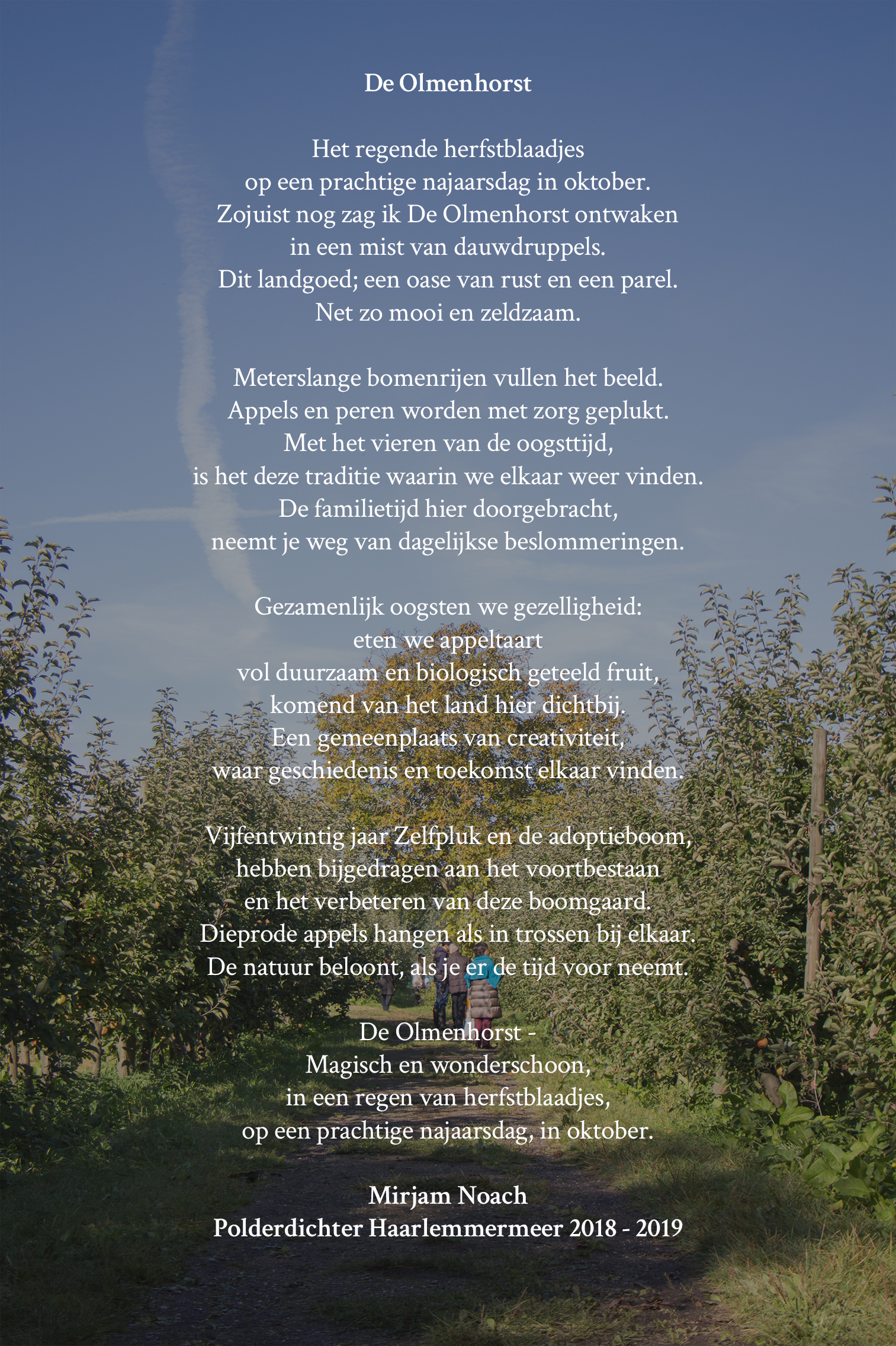 Landgoed de Olmenhorst. Bekend bij het overgrote deel van de inwoners van de Haarlemmermeer en daarbuiten. Deze prachtige plek met zijn boomgaard heeft een lange geschiedenis en kent al vijfentwintig jaar de Zelfpluk tijdens de oogsttijd. Een ware traditie die dit jaar, vanwege het jubileum, groots gevierd wordt. Hiervoor mocht ik een gedicht schrijven en voordragen. Een opdracht waaraan ik als Polderdichter Haarlemmermeer met veel plezier heb gewerkt.