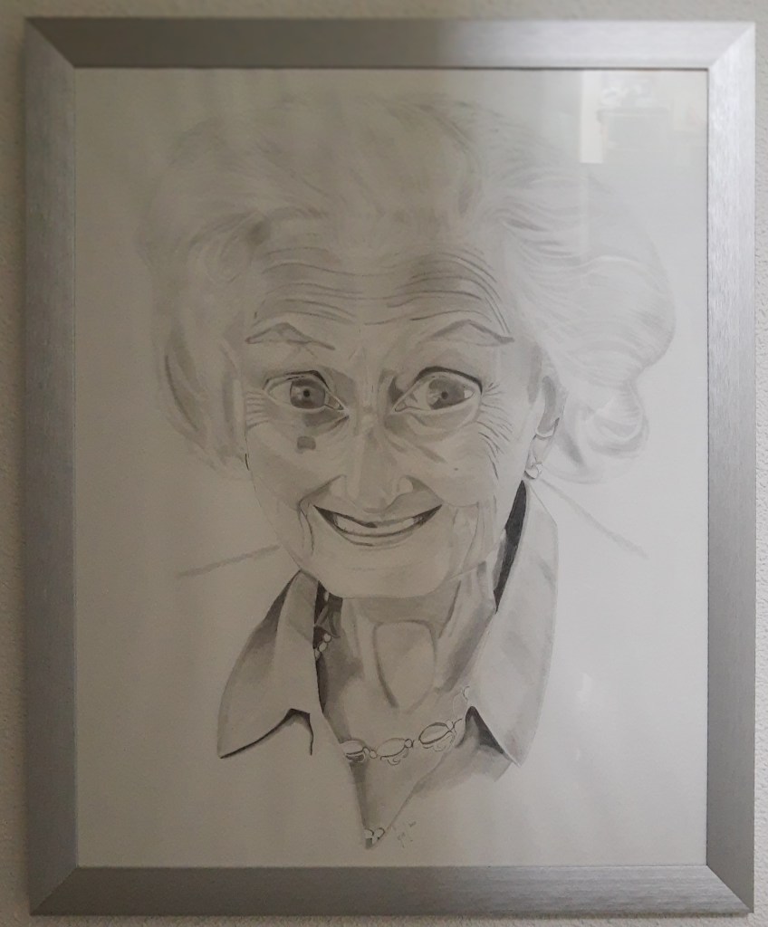 Misschien neem je nu wel meer ruimte in dan in mijn jeugd. Alsof ik je nu veel beter begrijp. Jij, lieve Johanna, verdient een portret. Een portret zoals ik je zie op de tekening die is gemaakt van de foto toen je tachtig jaar werd. Waar je haar zo mooi zit, je ogen groot zijn en stralen. Díe ogen, met die grijsblauwe kleur. De vrolijkheid en onbevangenheid die daarin zijn vastgelegd had ik je iedere dag van je leven gegund.